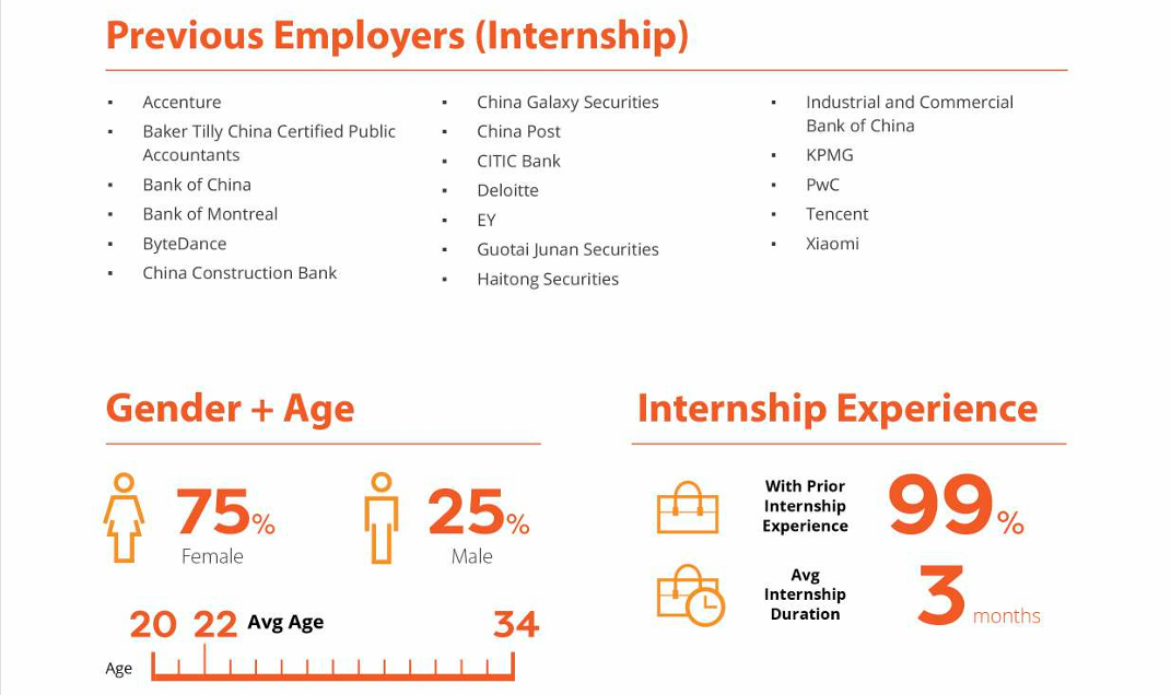 实习企业以四大会计师事务所(德勤、普华永道、安永、毕马威)为主流,其次为券商、投资银行及科技公司