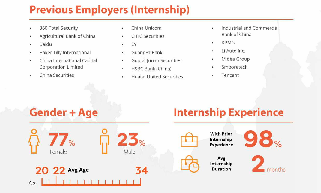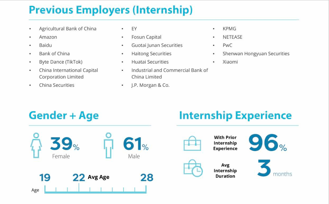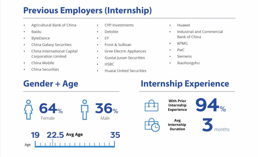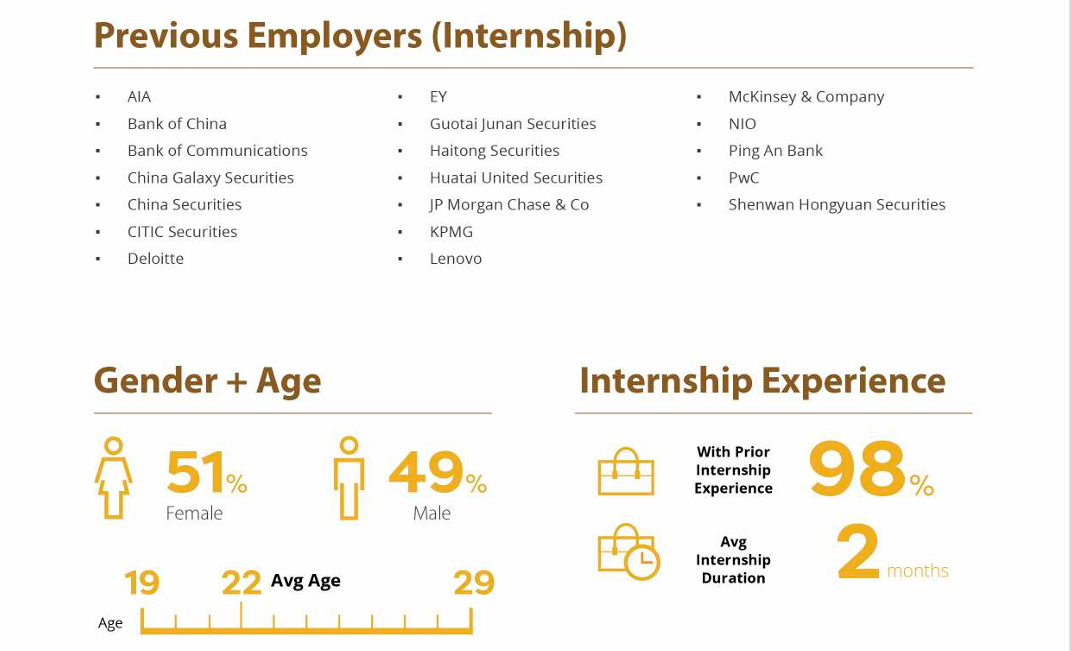 实习企业证券公司居多,其他还有顶级金融机构如毕马威、摩根大通(JPMorgan)等;98%的录取者具备相关实习或工作经验,平均时长2个月
