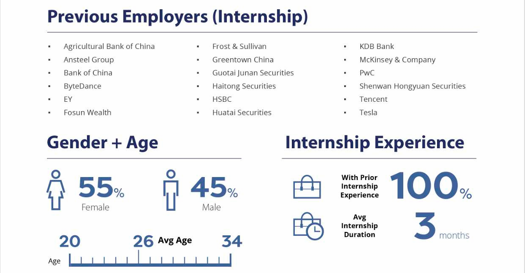 实习领域覆盖科技、咨询、快消、汽车等多个行业,典型企业包括特斯拉、宝洁、麦肯锡等;98%的录取者具备相关实习或工作经验,平均时长3个月。