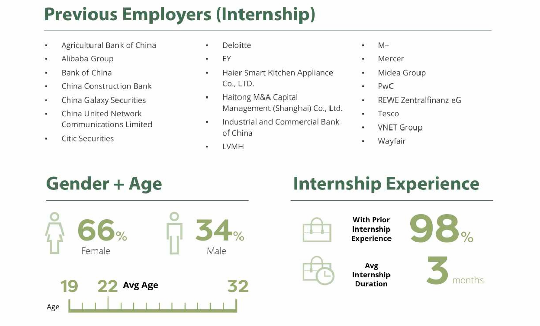 实习领域横跨金融(银行、证券、财富管理)、咨询、科技、实业、汽车及消费品等多个核心领域