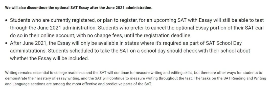 2021年6月之后,写作部分将只在那些需要SAT作为日常教学管理一部分的州提供。计划在学校参加SAT考试的学生应与学校核实是否包括写作部分。